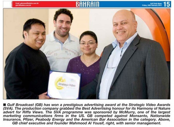 We were featured in the local Gulf Daily News in last Friday’s issue which showed our picture proudly holding the recently won SVA award. Thanks go to the GDN for supporting local businesses.