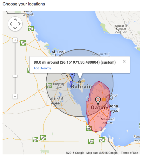 Say for example existing sales data suggests your Saudi customers are mostly located within 80 miles of your shop in Hamala and that you receive hardly any sales from Qatar. With radius location targeting in Adwords you’ll be able to specify your exact target market in Saudi’s Eastern Province as well as remove Qatar from your targeting options. (see image below).