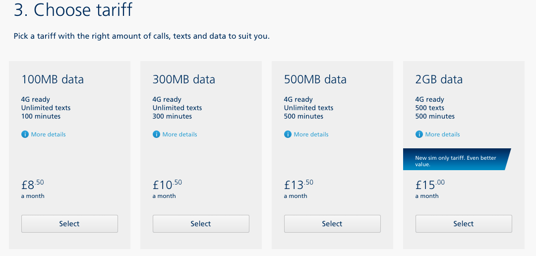 O2 goes for lists inside of columns to display their tariff data. They’ve reduced the amount of information to a bare minimum, included ‘more details’ as links and focused on the ‘data’ variable.