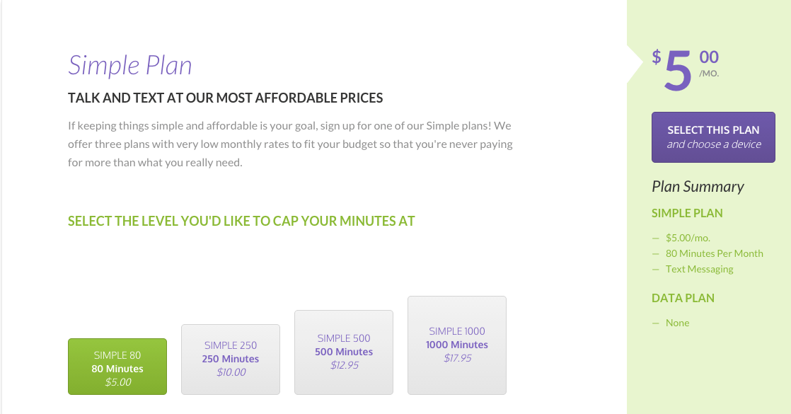 The Pure Talk page uses interactive elements with simple visual cues to indicate different price plans. Press a rectangle and the pricing information appears on the right. Scroll down the page and pricing information scrolls also. This page deals the problem of information overload by asking the user to select from only 1 variable – minutes – rather than presenting people with choices about data, texts, minutes, networks and handsets etc.