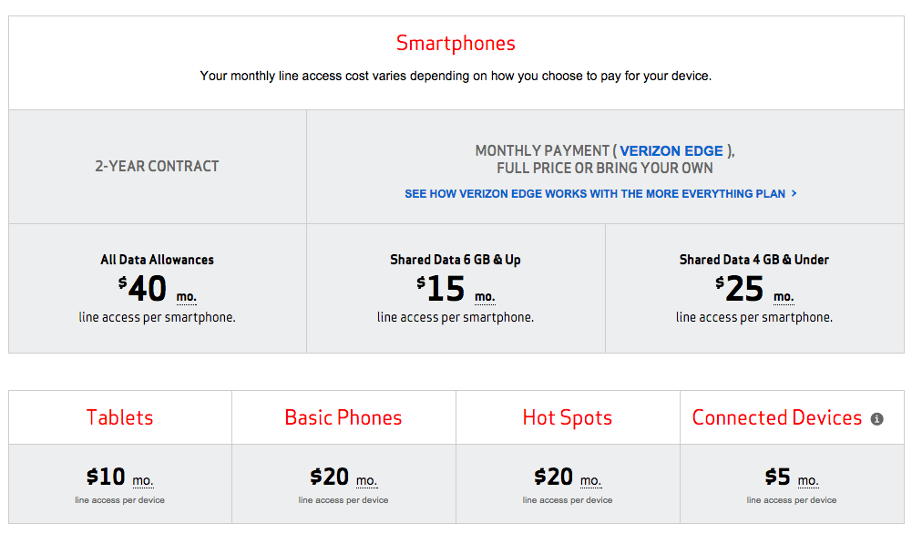 Verizon uses a spreadsheet style table similar to Zain. The table is simplified and has better colour coding, but like the Zain page is hard to read and even harder to understand.
